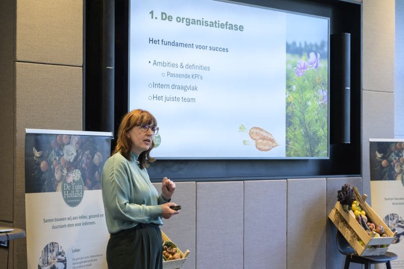 Aphra van den Berg, programmaleider van de Tuin van Holland, opende de middag met de vraag die aan de basis staat van veel van onze projecten: “Hoe kan het wél?” Hoe kunnen we zorgen dat regionale, natuurinclusieve producten niet alleen worden geteeld, maar ook daadwerkelijk hun weg vinden naar publieke keukens, bedrijfsrestaurants en zorginstellingen?