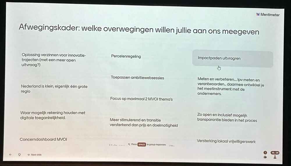 Nog een tip over het formuleren van de uitvraag: leg meer focus op de aspecten ‘stimuleren’ en ‘transitie versterkend’ in plaats van prijs en doelmatigheid.